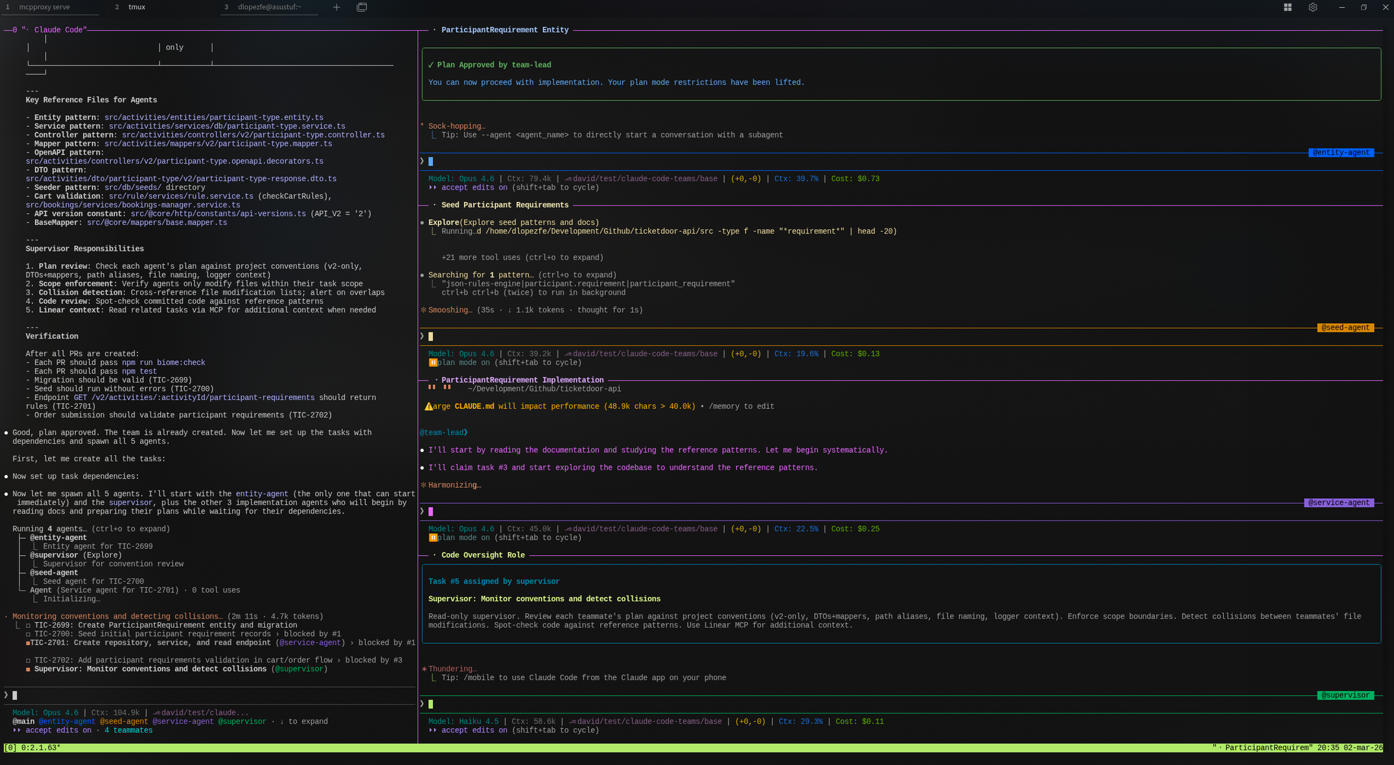 Something similar happened with the dependencies between tickets. Even though the sequence was incremental (ticket 2 needed ticket 1's entity, ticket 4 needed ticket 3's service), all four agents started in parallel. There was no real blocking or sequential coordination. And yet, the result was surprisingly coherent: the interfaces defined by the entity agent were compatible with what the subsequent agents assumed. It's hard to attribute this to deep intelligent coordination; it was likely a combination of luck and the extreme solidity of the CLAUDE.md and project documentation.