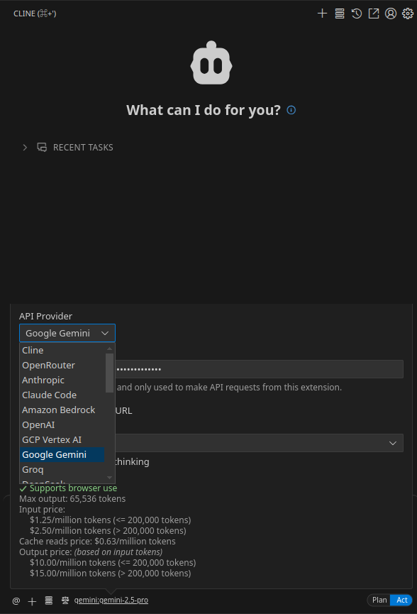 As I mentioned, this is Cline's hallmark and its key differentiator. The "Plan & Act" cycle is a two-mode system that emphasizes careful planning before implementation. The goal is simple: to help you create more accurate and maintainable code, reducing iteration time.